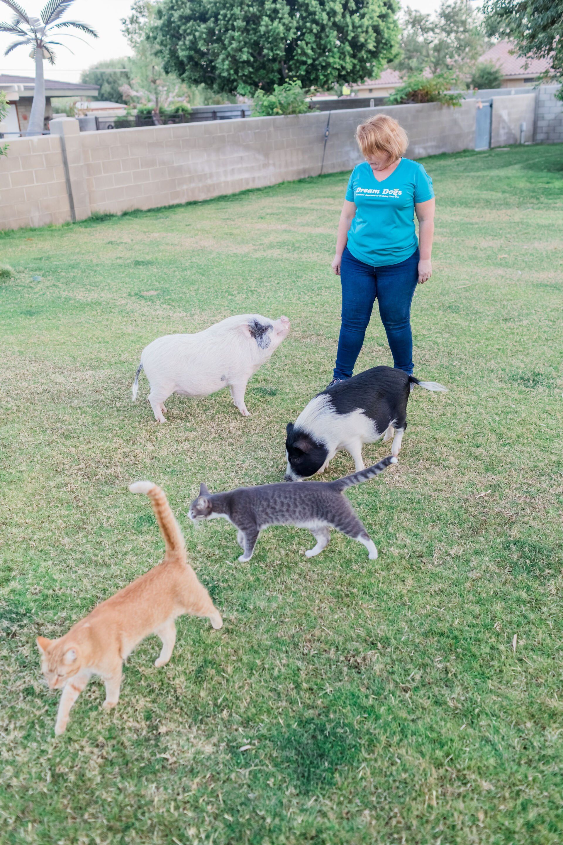 Here at Dream Dogs we often refer to our facility as Dream Acres and have a variety of farm animals on the property. All the animals are trained, and some are used in classes as distractions if needed. Our staff loves and cares for the farm animals and they are our pets.